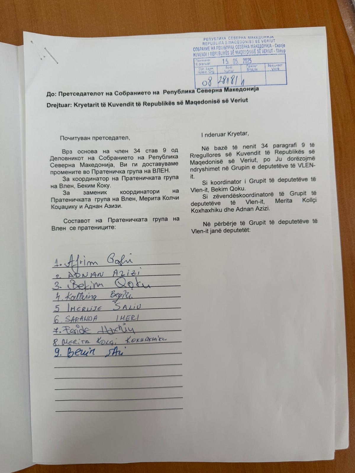Gjatë ditës së sotme, grupi parlamentar i VLEN, pa deputetët e Aleancës për Shqiptarët krahu i Taravarit, ka dërguar një kërkesë zyrtare deri te Kryetari i Parlamentit, Afrim Gashi për ta ndryshuar koordinatorin e grupit parlamentar të VLEN.