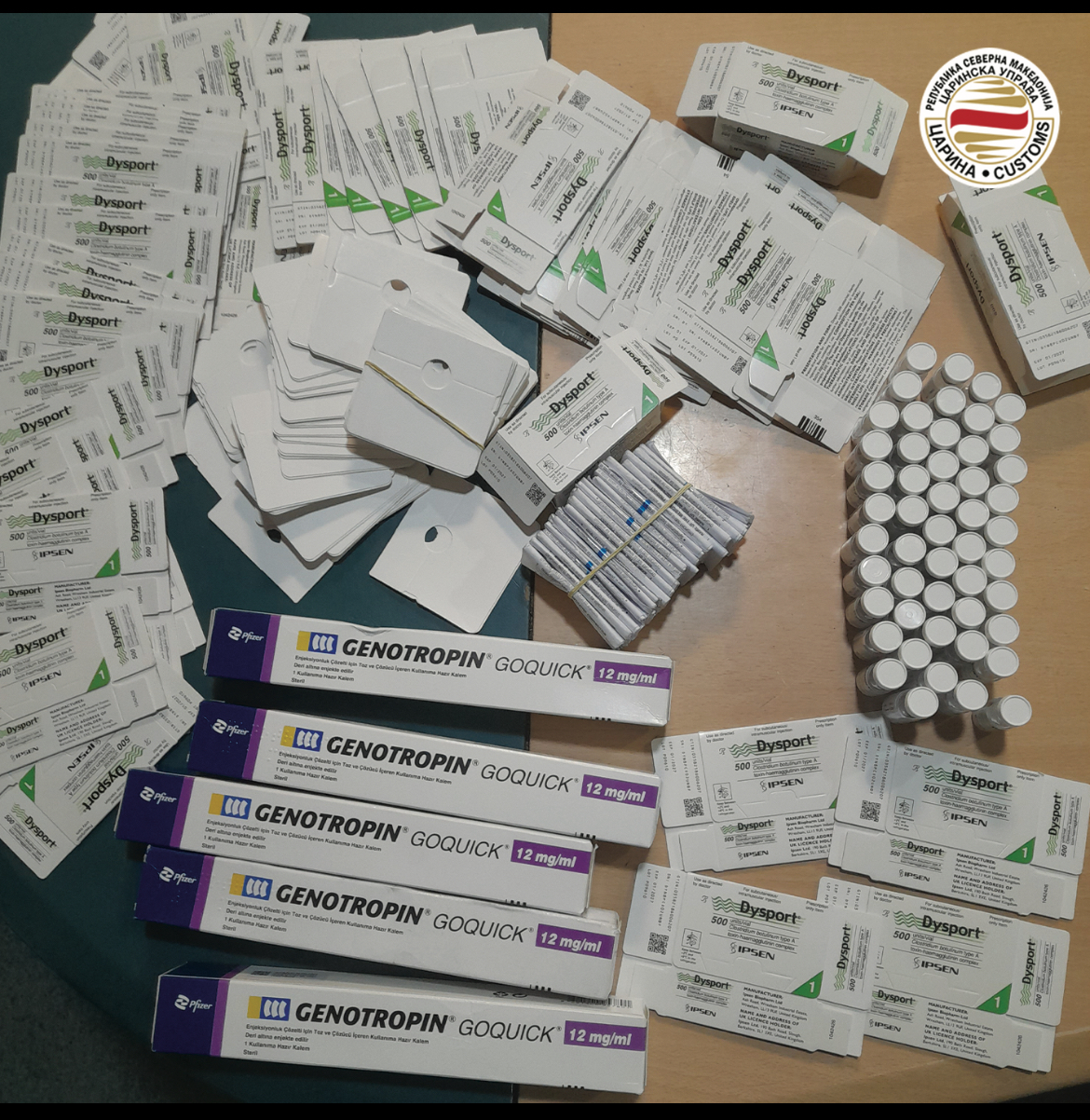 • U pengua një përpjekje për të kontrabanduar ilaçe në pikën kufitare Deve Bair. U sekuestruan pesë ampula Genotropin GoQuick prej 12 mg, që përdoren për mungesën e hormonit të rritjes, dhe 50 flakona Dysport, një tretësirë ​​injektuese, që përdoret për distoninë cervikale dhe qëllime të tjera mjekësore, importi i të cilave në vend i nënshtrohet lejeve të posaçme nga institucionet kompetente dhe është i rregulluar në mënyrë strikte. Departamenti i Kontrollit dhe Hetimeve ka ngritur kallëzim penal kundër autorit të krimit. Rasti u zbulua nga oficerët doganorë në hyrje të vendit në pikën kufitare Deve Bair gjatë një kontrolli të një autobusi që udhëtonte në linjën Maqedoni e Veriut – Turqi – Maqedoni e Veriut. Përveç ilaçeve, në çantën e shoferit u gjetën 20 kuti me mjaltë me nga 170 kg, 177 copë çokollatë, tre kilogramë çaj, si dhe mbi 40 copë xhinse me logo të mbrojtura të markave tregtare.